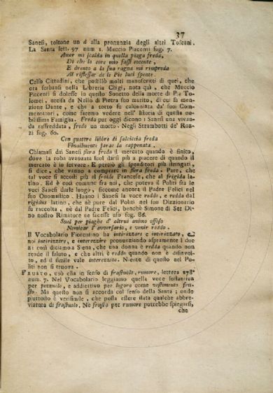 Gigli, Girolamo <1660-1722> Vocabolario cateriniano di Girolamo Gigli da lui lasciato imperfetto alla lettera R e che in questa seconda impressione si dà compito ove si spiegano e si difendono alcune voci, e frasi di s. Caterina da Siena usate da essa nelle sue opere, secondo il dialetto sanese, e sue proprie : con l'aggiunta della retrattazione del medesimo : della farsetta del Piato dell'H. di Pier Jacopo Martelli : e delle lettere di quasi tutte le Accademie d'Italia in approvazione della locuzione della santa. - A Manilla nell'isole Filippine [i. e. Lucca] : [s.n.], [dopo il 1722]. [2], ix, [1], xliv, 483 p., [1] c. di tav. : ill. ; 4° Firenze, Biblioteca dell'Accademia della Crusca, DIZ.220.CATERI./GIGL.1- Scheda OPAC |