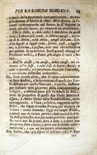 Gigli, Girolamo <1660-1722> Regole per la toscana favella : dichiarate per la piu stretta, e piu larga osservanza in dialogo tra maestro, e scolare. Con un saggio di tutti gl'idiomi toscani; ed una nuova prosod́a per la guista pronunzia di tutte le voci della lingua. Operetta ordinata all'istruzione dell'illustriss... signore D. Alessandro Ruspoli .... - In Roma : nella stamperia di Antonio de' Rossi, nella strada del Seminario romano, vicino alla rotonda, 1721. [24], 598, [1] p. ; 8° Firenze, Biblioteca dell'Accademia della Crusca, Fondo Migliorini 94- Scheda OPAC |