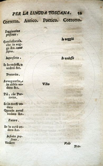 Gigli, Girolamo <1660-1722> Regole per la toscana favella : dichiarate per la piu stretta, e piu larga osservanza in dialogo tra maestro, e scolare. Con un saggio di tutti gl'idiomi toscani; ed una nuova prosod́a per la guista pronunzia di tutte le voci della lingua. Operetta ordinata all'istruzione dell'illustriss... signore D. Alessandro Ruspoli .... - In Roma : nella stamperia di Antonio de' Rossi, nella strada del Seminario romano, vicino alla rotonda, 1721. [24], 598, [1] p. ; 8° Firenze, Biblioteca dell'Accademia della Crusca, Fondo Migliorini 94- Scheda OPAC |