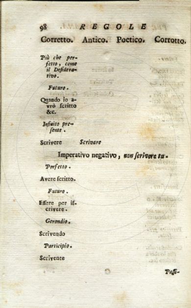 Gigli, Girolamo <1660-1722> Regole per la toscana favella : dichiarate per la piu stretta, e piu larga osservanza in dialogo tra maestro, e scolare. Con un saggio di tutti gl'idiomi toscani; ed una nuova prosod́a per la guista pronunzia di tutte le voci della lingua. Operetta ordinata all'istruzione dell'illustriss... signore D. Alessandro Ruspoli .... - In Roma : nella stamperia di Antonio de' Rossi, nella strada del Seminario romano, vicino alla rotonda, 1721. [24], 598, [1] p. ; 8° Firenze, Biblioteca dell'Accademia della Crusca, Fondo Migliorini 94- Scheda OPAC |
