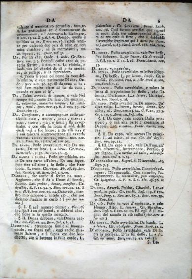 Vocabolario degli Accademici della Crusca compendiato secondo la quarta ed ultima impressione di Firenze corretta, ed accresciuta, cominciata l'anno 1729, e terminata nel mdccxxxviii. Tomo primo [-quinto]. - In Venezia : appresso Lorenzo Baseggio, 1741.