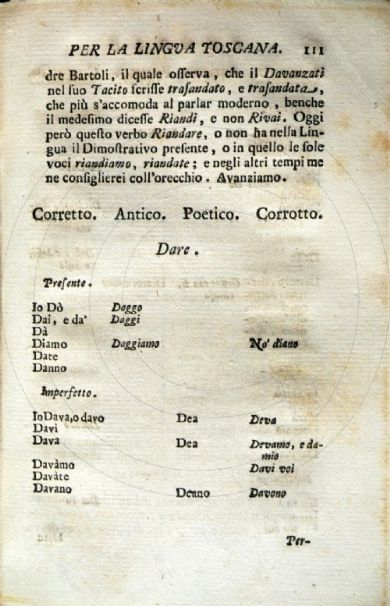 Gigli, Girolamo <1660-1722> Regole per la toscana favella : dichiarate per la piu stretta, e piu larga osservanza in dialogo tra maestro, e scolare. Con un saggio di tutti gl'idiomi toscani; ed una nuova prosod́a per la guista pronunzia di tutte le voci della lingua. Operetta ordinata all'istruzione dell'illustriss... signore D. Alessandro Ruspoli .... - In Roma : nella stamperia di Antonio de' Rossi, nella strada del Seminario romano, vicino alla rotonda, 1721. [24], 598, [1] p. ; 8° Firenze, Biblioteca dell'Accademia della Crusca, Fondo Migliorini 94- Scheda OPAC |