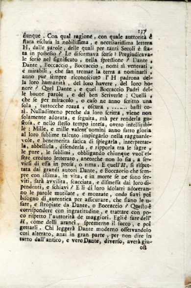 La Crusca in esame o sia Raccontamento di quanto è accaduto per ocasione di una lettera scritta da un amico all'altro. Unito a due libricciuoli, che hanno per titolo, primo: Osservazioni sopra i vocaboli ... secondo: Ragioni esposte dalla lettera H per la pretensione di entrare in tutto il verbo volgare Avere, e non finalmente nell'Ho, hai, ha, hanno. - Amsterdam [ma Venezia] : si vende da Domenico Occhi, 1740.
