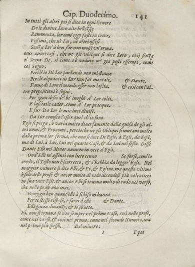 Ruscelli, Girolamo De' commentarii della lingua italiana del sig. Girolamo Ruscelli viterbese libri sette : ne' quali con facilità & copiosamente si tratta tutto quello che alla vera & perfetta notitia di detta lingua s'appartiene / hora posti in luce da Vincenzo Ruscelli ; con due Tauole, vna de' capitoli & l'altra delle cose più notabili .... - In Venetia : appresso Damian Zenaro, alla Salamandra, 1581. [16], 574, [2] p. ; 4° Firenze, Biblioteca dell'Accademia della Crusca, Fondo Migliorini 15- Scheda OPAC |