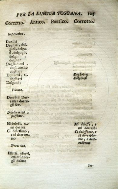 Gigli, Girolamo <1660-1722> Regole per la toscana favella : dichiarate per la piu stretta, e piu larga osservanza in dialogo tra maestro, e scolare. Con un saggio di tutti gl'idiomi toscani; ed una nuova prosod́a per la guista pronunzia di tutte le voci della lingua. Operetta ordinata all'istruzione dell'illustriss... signore D. Alessandro Ruspoli .... - In Roma : nella stamperia di Antonio de' Rossi, nella strada del Seminario romano, vicino alla rotonda, 1721. [24], 598, [1] p. ; 8° Firenze, Biblioteca dell'Accademia della Crusca, Fondo Migliorini 94- Scheda OPAC |