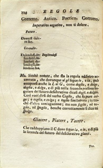 Gigli, Girolamo <1660-1722> Regole per la toscana favella : dichiarate per la piu stretta, e piu larga osservanza in dialogo tra maestro, e scolare. Con un saggio di tutti gl'idiomi toscani; ed una nuova prosod́a per la guista pronunzia di tutte le voci della lingua. Operetta ordinata all'istruzione dell'illustriss... signore D. Alessandro Ruspoli .... - In Roma : nella stamperia di Antonio de' Rossi, nella strada del Seminario romano, vicino alla rotonda, 1721. [24], 598, [1] p. ; 8° Firenze, Biblioteca dell'Accademia della Crusca, Fondo Migliorini 94- Scheda OPAC |