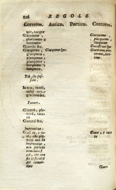 Gigli, Girolamo <1660-1722> Regole per la toscana favella : dichiarate per la piu stretta, e piu larga osservanza in dialogo tra maestro, e scolare. Con un saggio di tutti gl'idiomi toscani; ed una nuova prosod́a per la guista pronunzia di tutte le voci della lingua. Operetta ordinata all'istruzione dell'illustriss... signore D. Alessandro Ruspoli .... - In Roma : nella stamperia di Antonio de' Rossi, nella strada del Seminario romano, vicino alla rotonda, 1721. [24], 598, [1] p. ; 8° Firenze, Biblioteca dell'Accademia della Crusca, Fondo Migliorini 94- Scheda OPAC |