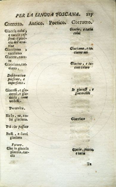 Gigli, Girolamo <1660-1722> Regole per la toscana favella : dichiarate per la piu stretta, e piu larga osservanza in dialogo tra maestro, e scolare. Con un saggio di tutti gl'idiomi toscani; ed una nuova prosod́a per la guista pronunzia di tutte le voci della lingua. Operetta ordinata all'istruzione dell'illustriss... signore D. Alessandro Ruspoli .... - In Roma : nella stamperia di Antonio de' Rossi, nella strada del Seminario romano, vicino alla rotonda, 1721. [24], 598, [1] p. ; 8° Firenze, Biblioteca dell'Accademia della Crusca, Fondo Migliorini 94- Scheda OPAC |