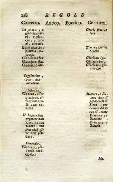 Gigli, Girolamo <1660-1722> Regole per la toscana favella : dichiarate per la piu stretta, e piu larga osservanza in dialogo tra maestro, e scolare. Con un saggio di tutti gl'idiomi toscani; ed una nuova prosod́a per la guista pronunzia di tutte le voci della lingua. Operetta ordinata all'istruzione dell'illustriss... signore D. Alessandro Ruspoli .... - In Roma : nella stamperia di Antonio de' Rossi, nella strada del Seminario romano, vicino alla rotonda, 1721. [24], 598, [1] p. ; 8° Firenze, Biblioteca dell'Accademia della Crusca, Fondo Migliorini 94- Scheda OPAC |