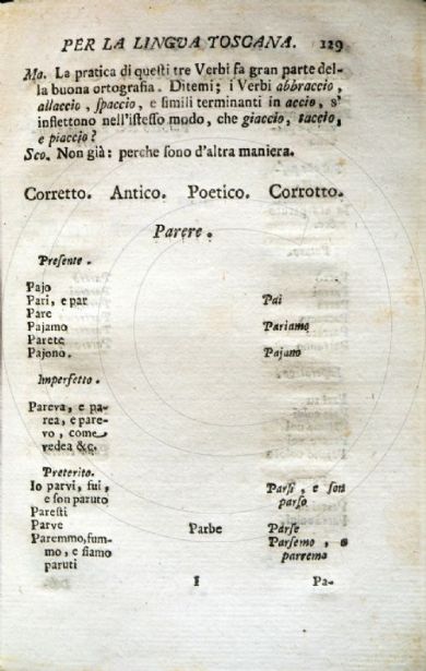 Gigli, Girolamo <1660-1722> Regole per la toscana favella : dichiarate per la piu stretta, e piu larga osservanza in dialogo tra maestro, e scolare. Con un saggio di tutti gl'idiomi toscani; ed una nuova prosod́a per la guista pronunzia di tutte le voci della lingua. Operetta ordinata all'istruzione dell'illustriss... signore D. Alessandro Ruspoli .... - In Roma : nella stamperia di Antonio de' Rossi, nella strada del Seminario romano, vicino alla rotonda, 1721. [24], 598, [1] p. ; 8° Firenze, Biblioteca dell'Accademia della Crusca, Fondo Migliorini 94- Scheda OPAC |