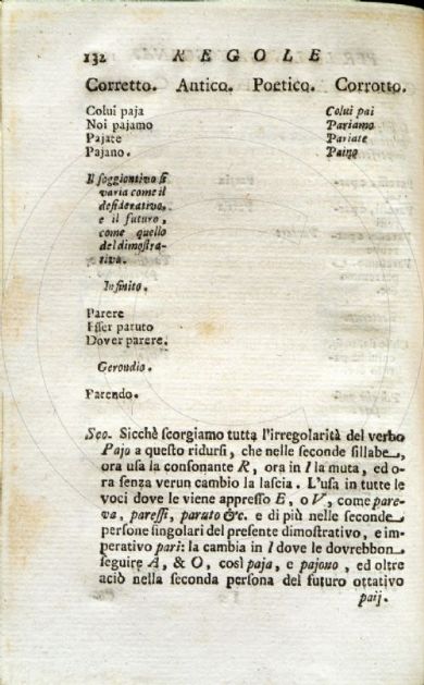 Gigli, Girolamo <1660-1722> Regole per la toscana favella : dichiarate per la piu stretta, e piu larga osservanza in dialogo tra maestro, e scolare. Con un saggio di tutti gl'idiomi toscani; ed una nuova prosod́a per la guista pronunzia di tutte le voci della lingua. Operetta ordinata all'istruzione dell'illustriss... signore D. Alessandro Ruspoli .... - In Roma : nella stamperia di Antonio de' Rossi, nella strada del Seminario romano, vicino alla rotonda, 1721. [24], 598, [1] p. ; 8° Firenze, Biblioteca dell'Accademia della Crusca, Fondo Migliorini 94- Scheda OPAC |