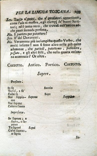 Gigli, Girolamo <1660-1722> Regole per la toscana favella : dichiarate per la piu stretta, e piu larga osservanza in dialogo tra maestro, e scolare. Con un saggio di tutti gl'idiomi toscani; ed una nuova prosod́a per la guista pronunzia di tutte le voci della lingua. Operetta ordinata all'istruzione dell'illustriss... signore D. Alessandro Ruspoli .... - In Roma : nella stamperia di Antonio de' Rossi, nella strada del Seminario romano, vicino alla rotonda, 1721. [24], 598, [1] p. ; 8° Firenze, Biblioteca dell'Accademia della Crusca, Fondo Migliorini 94- Scheda OPAC |