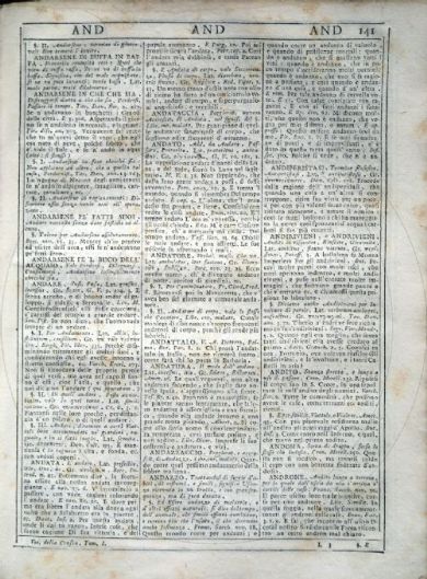 Vocabolario degli Accademici della Crusca Vocabolario degli Accademici della Crusca. Volume primo [-quinto]. - Quinta impressione. - In Venezia : appresso Francesco Pitteri, 1741. 5 v. ; 4° Firenze, Biblioteca dell'Accademia della Crusca, DIZ.115.1741.2.1-5- Scheda OPAC Volumi dell'opera: Vol. 1 Vol. 2 Vol. 3 Vol. 4 Vol. 5 |