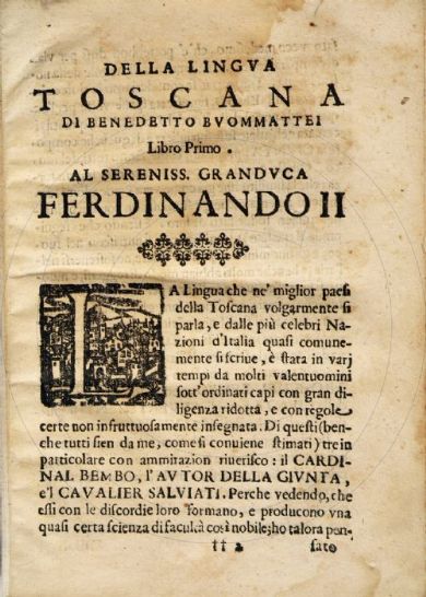 Della lingua toscana di Benedetto Buommattei pubblico lettor di essa nello Studio pisano e nell'Accademia fiorentina libri due .... - Impressione terza. - In Firenze : per Zanobi Pignoni, 1643.