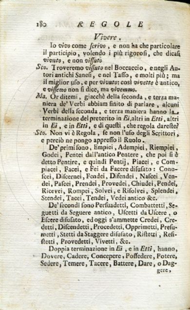 Gigli, Girolamo <1660-1722> Regole per la toscana favella : dichiarate per la piu stretta, e piu larga osservanza in dialogo tra maestro, e scolare. Con un saggio di tutti gl'idiomi toscani; ed una nuova prosod́a per la guista pronunzia di tutte le voci della lingua. Operetta ordinata all'istruzione dell'illustriss... signore D. Alessandro Ruspoli .... - In Roma : nella stamperia di Antonio de' Rossi, nella strada del Seminario romano, vicino alla rotonda, 1721. [24], 598, [1] p. ; 8° Firenze, Biblioteca dell'Accademia della Crusca, Fondo Migliorini 94- Scheda OPAC |
