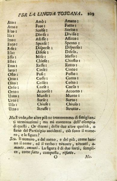 Gigli, Girolamo <1660-1722> Regole per la toscana favella : dichiarate per la piu stretta, e piu larga osservanza in dialogo tra maestro, e scolare. Con un saggio di tutti gl'idiomi toscani; ed una nuova prosod́a per la guista pronunzia di tutte le voci della lingua. Operetta ordinata all'istruzione dell'illustriss... signore D. Alessandro Ruspoli .... - In Roma : nella stamperia di Antonio de' Rossi, nella strada del Seminario romano, vicino alla rotonda, 1721. [24], 598, [1] p. ; 8° Firenze, Biblioteca dell'Accademia della Crusca, Fondo Migliorini 94- Scheda OPAC |