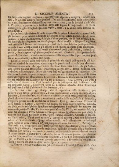 Amenta, Niccolò Della lingua nobile d'Italia, e del modo di leggiadramente scrivere in essa, non che di perfettamente parlare / di Niccolò Amenta ... parte prima [-seconda]. - In Napoli : nella Stamperia ed a spese di Antonio Muzio, 1723-1724. 2 v. ; 23 cm Firenze, Biblioteca dell'Accademia della Crusca, Fondo Migliorini 84/86- Scheda OPAC Volumi dell'opera: Pt. 1 Pt. 2 |