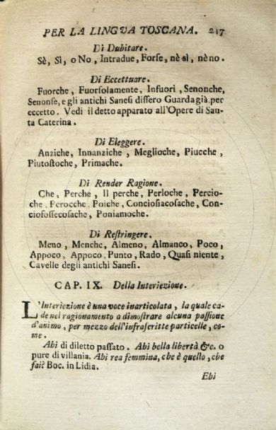 Gigli, Girolamo <1660-1722> Regole per la toscana favella : dichiarate per la piu stretta, e piu larga osservanza in dialogo tra maestro, e scolare. Con un saggio di tutti gl'idiomi toscani; ed una nuova prosod́a per la guista pronunzia di tutte le voci della lingua. Operetta ordinata all'istruzione dell'illustriss... signore D. Alessandro Ruspoli .... - In Roma : nella stamperia di Antonio de' Rossi, nella strada del Seminario romano, vicino alla rotonda, 1721. [24], 598, [1] p. ; 8° Firenze, Biblioteca dell'Accademia della Crusca, Fondo Migliorini 94- Scheda OPAC |