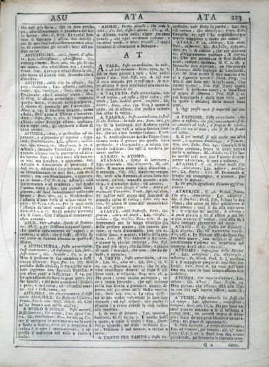 Vocabolario degli Accademici della Crusca Vocabolario degli Accademici della Crusca. Volume primo [-quinto]. - Quinta impressione. - In Venezia : appresso Francesco Pitteri, 1741. 5 v. ; 4° Firenze, Biblioteca dell'Accademia della Crusca, DIZ.115.1741.2.1-5- Scheda OPAC Volumi dell'opera: Vol. 1 Vol. 2 Vol. 3 Vol. 4 Vol. 5 |