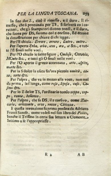 Gigli, Girolamo <1660-1722> Regole per la toscana favella : dichiarate per la piu stretta, e piu larga osservanza in dialogo tra maestro, e scolare. Con un saggio di tutti gl'idiomi toscani; ed una nuova prosod́a per la guista pronunzia di tutte le voci della lingua. Operetta ordinata all'istruzione dell'illustriss... signore D. Alessandro Ruspoli .... - In Roma : nella stamperia di Antonio de' Rossi, nella strada del Seminario romano, vicino alla rotonda, 1721. [24], 598, [1] p. ; 8° Firenze, Biblioteca dell'Accademia della Crusca, Fondo Migliorini 94- Scheda OPAC |