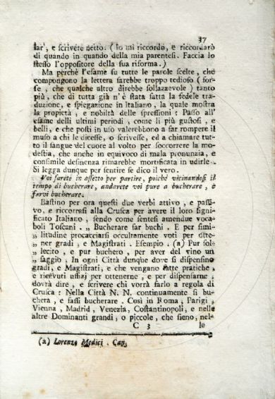 La Crusca in esame o sia Raccontamento di quanto è accaduto per ocasione di una lettera scritta da un amico all'altro. Unito a due libricciuoli, che hanno per titolo, primo: Osservazioni sopra i vocaboli ... secondo: Ragioni esposte dalla lettera H per la pretensione di entrare in tutto il verbo volgare Avere, e non finalmente nell'Ho, hai, ha, hanno. - Amsterdam [ma Venezia] : si vende da Domenico Occhi, 1740.