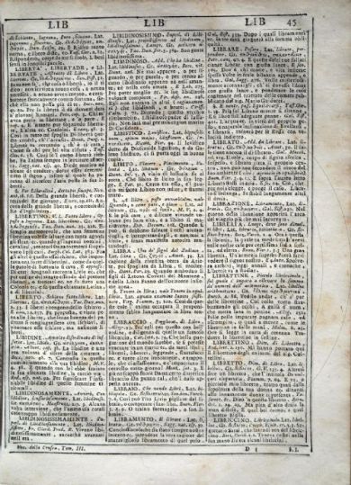 Vocabolario degli Accademici della Crusca Vocabolario degli Accademici della Crusca. Volume primo [-quinto]. - Quinta impressione. - In Venezia : appresso Francesco Pitteri, 1741. 5 v. ; 4° Firenze, Biblioteca dell'Accademia della Crusca, DIZ.115.1741.2.1-5- Scheda OPAC Volumi dell'opera: Vol. 1 Vol. 2 Vol. 3 Vol. 4 Vol. 5 |