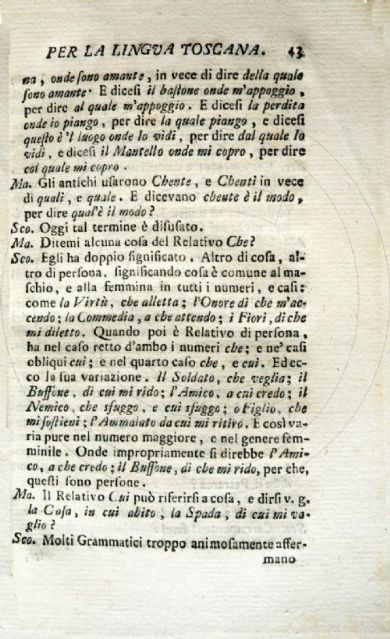 Gigli, Girolamo <1660-1722> Regole per la toscana favella : dichiarate per la piu stretta, e piu larga osservanza in dialogo tra maestro, e scolare. Con un saggio di tutti gl'idiomi toscani; ed una nuova prosod́a per la guista pronunzia di tutte le voci della lingua. Operetta ordinata all'istruzione dell'illustriss... signore D. Alessandro Ruspoli .... - In Roma : nella stamperia di Antonio de' Rossi, nella strada del Seminario romano, vicino alla rotonda, 1721. [24], 598, [1] p. ; 8° Firenze, Biblioteca dell'Accademia della Crusca, Fondo Migliorini 94- Scheda OPAC |