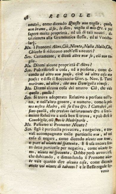 Gigli, Girolamo <1660-1722> Regole per la toscana favella : dichiarate per la piu stretta, e piu larga osservanza in dialogo tra maestro, e scolare. Con un saggio di tutti gl'idiomi toscani; ed una nuova prosod́a per la guista pronunzia di tutte le voci della lingua. Operetta ordinata all'istruzione dell'illustriss... signore D. Alessandro Ruspoli .... - In Roma : nella stamperia di Antonio de' Rossi, nella strada del Seminario romano, vicino alla rotonda, 1721. [24], 598, [1] p. ; 8° Firenze, Biblioteca dell'Accademia della Crusca, Fondo Migliorini 94- Scheda OPAC |