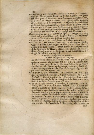 Gigli, Girolamo <1660-1722> Vocabolario cateriniano di Girolamo Gigli da lui lasciato imperfetto alla lettera R e che in questa seconda impressione si dà compito ove si spiegano e si difendono alcune voci, e frasi di s. Caterina da Siena usate da essa nelle sue opere, secondo il dialetto sanese, e sue proprie : con l'aggiunta della retrattazione del medesimo : della farsetta del Piato dell'H. di Pier Jacopo Martelli : e delle lettere di quasi tutte le Accademie d'Italia in approvazione della locuzione della santa. - A Manilla nell'isole Filippine [i. e. Lucca] : [s.n.], [dopo il 1722]. [2], ix, [1], xliv, 483 p., [1] c. di tav. : ill. ; 4° Firenze, Biblioteca dell'Accademia della Crusca, DIZ.220.CATERI./GIGL.1- Scheda OPAC |