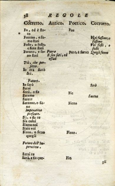 Gigli, Girolamo <1660-1722> Regole per la toscana favella : dichiarate per la piu stretta, e piu larga osservanza in dialogo tra maestro, e scolare. Con un saggio di tutti gl'idiomi toscani; ed una nuova prosod́a per la guista pronunzia di tutte le voci della lingua. Operetta ordinata all'istruzione dell'illustriss... signore D. Alessandro Ruspoli .... - In Roma : nella stamperia di Antonio de' Rossi, nella strada del Seminario romano, vicino alla rotonda, 1721. [24], 598, [1] p. ; 8° Firenze, Biblioteca dell'Accademia della Crusca, Fondo Migliorini 94- Scheda OPAC |
