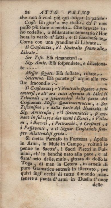Scena 1: Il Sig. Neutralio, e 'l Sig. Anticrusco con seguito di numerosi Soldati, portanti tutti nel sinistro braccio per Scudo un gran Libraccio [...]