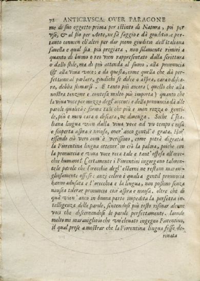 Beni, Paolo L'anticrusca overo Il paragone dell'italiana lingua : nel qual si mostra chiaramente che l'antica sia inculta e rozza e la moderna regolata e gentile / di Paolo Beni .... - Padova : In casa & a spese dell'autore, per B. Martini|1612. [8], 134, [5] p. ; 20 cm Firenze, Biblioteca dell'Accademia della Crusca, Fondo Migliorini 110- Scheda OPAC |